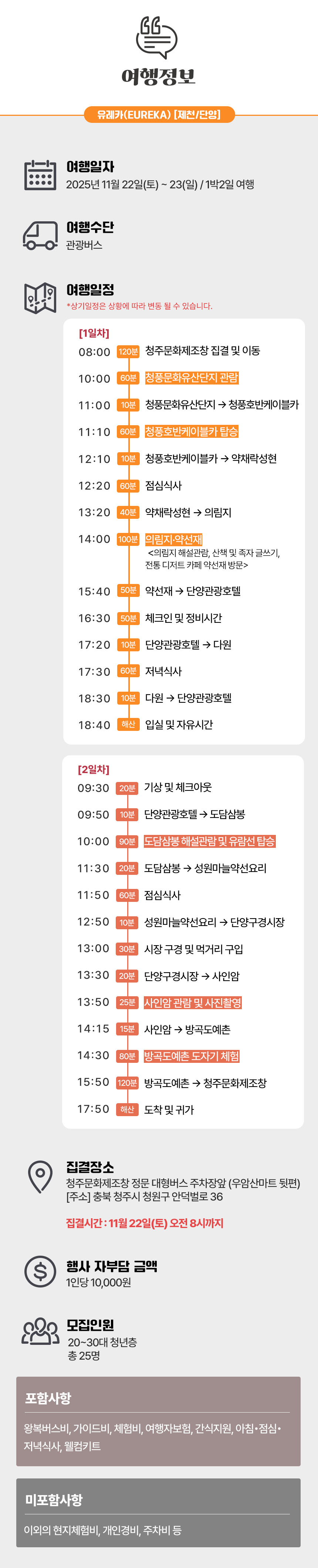 1일차: 청풍문화유산단지,약채락성현,의림지·약선재, 다원 2인차: 도담상봉, 단양시장, 사인암, 방곡도예촌